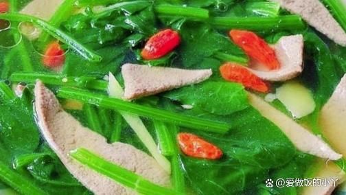 第三步:鍋中燒水,加入姜片,少許豬油、胡椒粉煮開后開小火加入豬肝,撈出浮沫,再下入菠菜,撒入枸杞,調(diào)入鹽、雞精后起鍋即可。