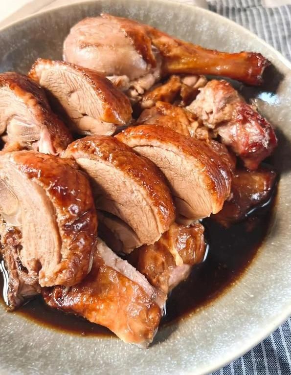 -制作步驟:首先將鴨子清洗干凈,然后倒入熱水,使鴨皮收縮平整。之后用廚房紙巾將鴨子表面和內(nèi)部擦干,然后將其架起來(lái),放在通風(fēng)處風(fēng)干,或者放入冰箱冷藏?cái)?shù)小時(shí)以上,直到表皮完全干爽。接下來(lái)將鹽和五香粉混合,涂抹在鴨子的內(nèi)部和表面。然后混合醬油、米酒蜂蜜,均勻地涂抹在鴨子表面,并蓋上錫箔紙,放入冰箱冷藏24小時(shí)以上。最后將鴨子拿出來(lái)晾干,放入預(yù)熱至200攝氏度的烤箱中烤1小時(shí),接著調(diào)低溫度至180攝氏度,再烤1小時(shí)即可。