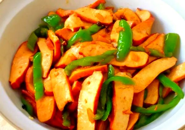 另起鍋,焯燙豆腐干至熟軟。