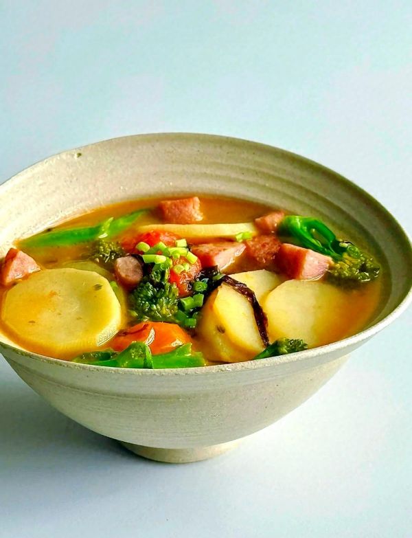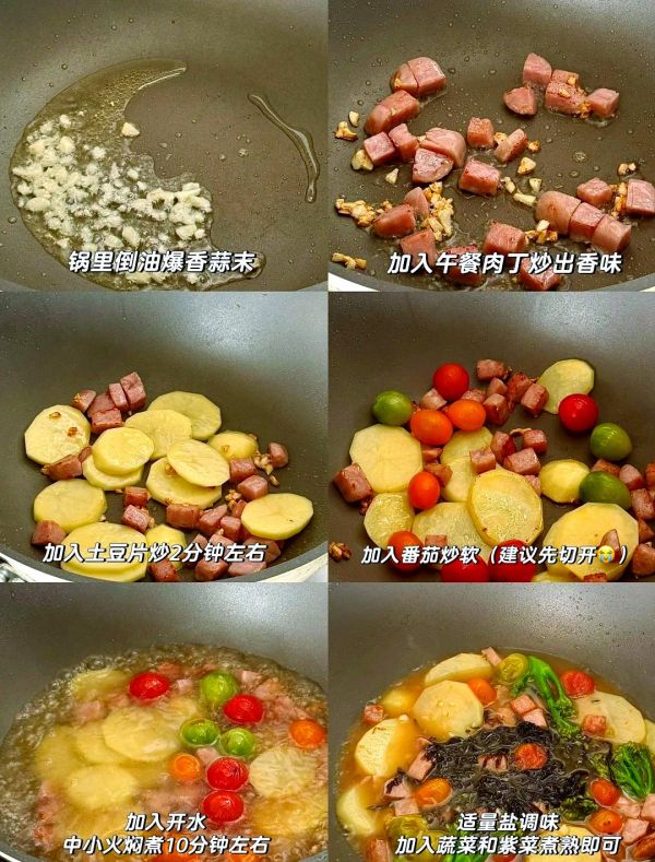 食材:土豆、番茄、午餐肉、蔬菜(推薦使用生菜或白菜,口感更佳)、紫菜。