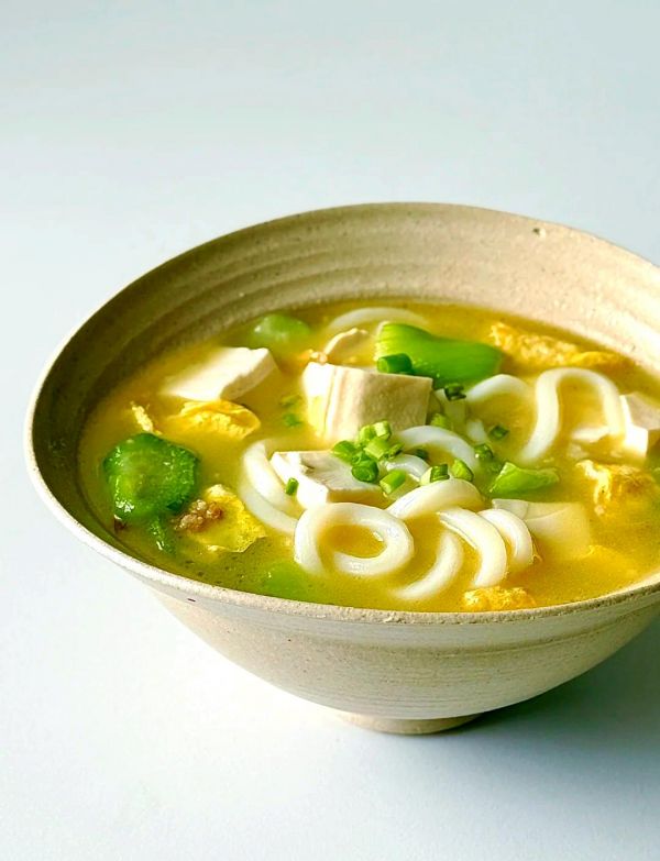 將豆腐塊和烏冬面加入鍋中,與絲瓜一起煮煮2分鐘,讓食材充分吸收湯汁。