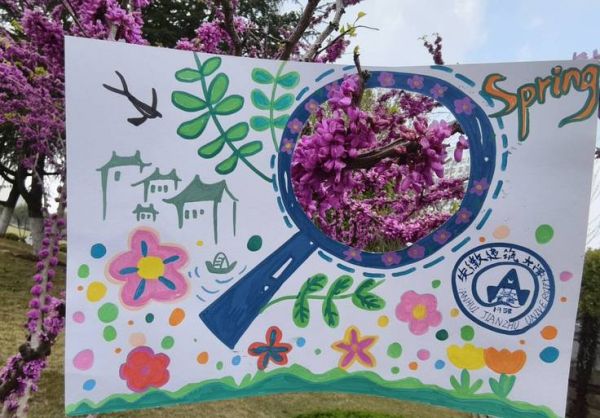活動(dòng)以漢字“春”為創(chuàng)意核心,鼓勵(lì)同學(xué)們親手制作鏤空“春”字卡片,將校園春日盛景嵌入字間,以“字為框、景為畫”的獨(dú)特形式,定格春日美好。同學(xué)們走出宿舍、走進(jìn)自然,在櫻花、海棠、玉蘭、杜鵑等春日繁花間取景創(chuàng)作,用畫筆、手工與鏡頭,將漢字之美與自然之韻融為一體。一張張創(chuàng)意作品既展現(xiàn)了外院學(xué)子的審美創(chuàng)造力,也讓同學(xué)們在親近自然、動(dòng)手創(chuàng)作的過程中舒緩了學(xué)業(yè)壓力,放松了身心,實(shí)現(xiàn)了美育浸潤與心理疏導(dǎo)的雙向賦能。