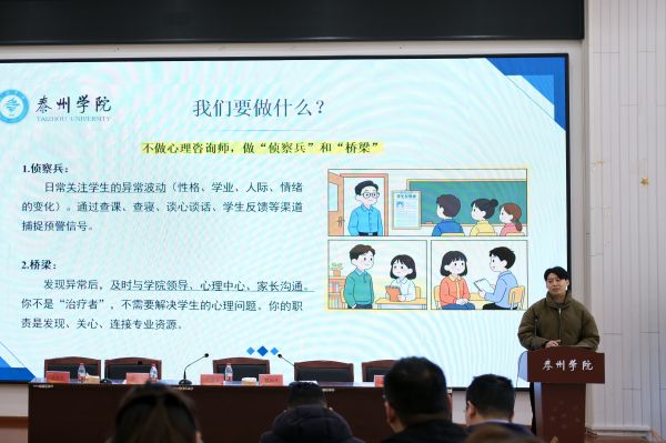 為進一步筑牢校園心理安全防線,提升一線工作人員對學生心理危機的識別與應對能力,3月30日-31日,我校在二適樓C2108舉辦了兩場“校園‘心’護者-校園心理危機的識別與應對”專題講座,全體輔導員及安保、宿管人員共100多人參加培訓。