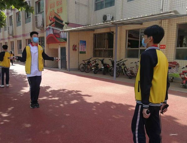 學校實行“錯班、錯時、錯峰制”開展活動,大課間,在班主任和體育教師陪伴指導下,兩人一組,單列成排,保持安全距離,有序到指定區(qū)域進行一分鐘跳繩。沐浴明媚日光,迎著微風花香,青春的色彩與舞動的彩繩在教學樓前、操場上、旗臺旁閃亮著,跳躍著。
