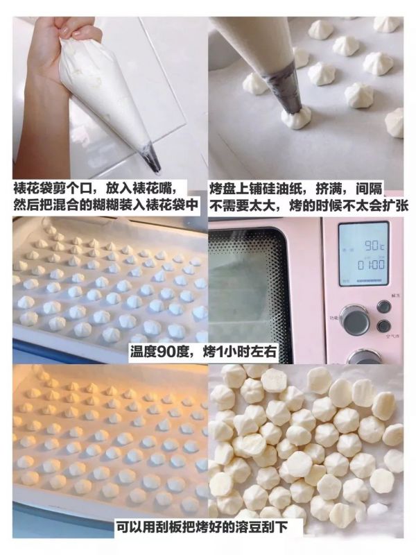 05 烤箱提前預(yù)熱,90度,預(yù)熱好后把烤盤放進(jìn)去烤1小時(shí)左右,烤好后可以用刮板把溶豆豆刮下來(lái)裝罐保存