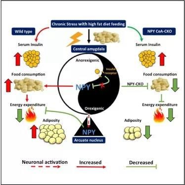 進一步研究顯示,高脂飲食和壓力的作用,使得胰島素對中央杏仁核中NPY分泌的抑制作用減弱,NPY分泌增加,一邊對抗焦慮,一邊增加食欲,并影響弓狀核中的NPY神經(jīng)元,減少能量消耗。