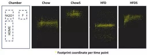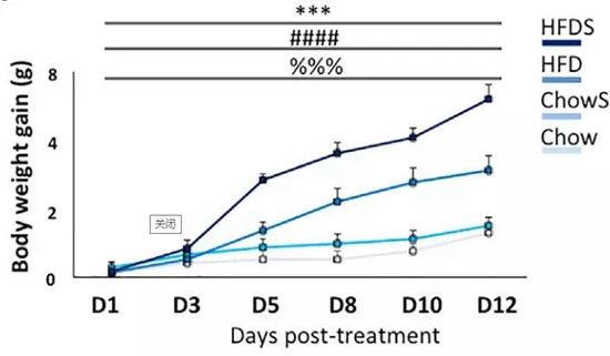 研究人員將小鼠按吃高脂飼料還是普通飼料、是否承受壓力2×2地分成了普通飼料無壓力(Chow)、普通飼料有壓力(ChowS)、高脂飼料無壓力(HFD)和高脂飼料有壓力(HFDS)四組,通過水漫鼠籠給小鼠制造精神壓力,讓小鼠血清中壓力標(biāo)志物皮質(zhì)酮水平顯著增高。