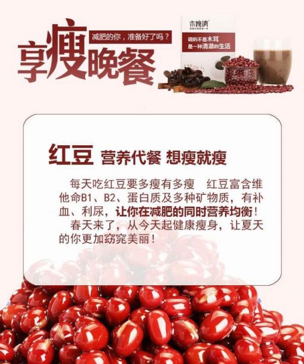 主要功效:黑木耳為膠質(zhì)菇的一種,干燥后再吸水的膨脹系數(shù)很高,飽腹感極強(qiáng),以致于不易覺得餓;另加上我們的專利超微粉碎技術(shù),吸附體內(nèi)垃和多余脂肪的能力達(dá)到了80倍以上,因?yàn)槌⒎肿痈菀诐B透到體內(nèi),達(dá)到減肥的目的。 黑木耳含有纖維素、半纖維素、果膠,蛋白質(zhì),脂肪,卵磷脂,胡蘿卜素等食用纖維,促進(jìn)胃腸蠕動(dòng),幫助排便和代謝掉體內(nèi)多余脂肪,達(dá)到減肥降脂的目的。其所含的黑木耳多糖可以有效的抑制脂肪的形成,并且明顯的降膽固醇的作用,達(dá)到減肥的目的。紅豆有較多的膳食纖維,具有良好的潤(rùn)腸通便、預(yù)防結(jié)石、健美減肥的作用。同時(shí),紅豆富含維他命B1、B2、蛋白質(zhì)及多種礦物質(zhì),有補(bǔ)血、利尿、消腫、促進(jìn)心臟活化等功效。多吃可預(yù)防及治療腳腫,有減肥之效。