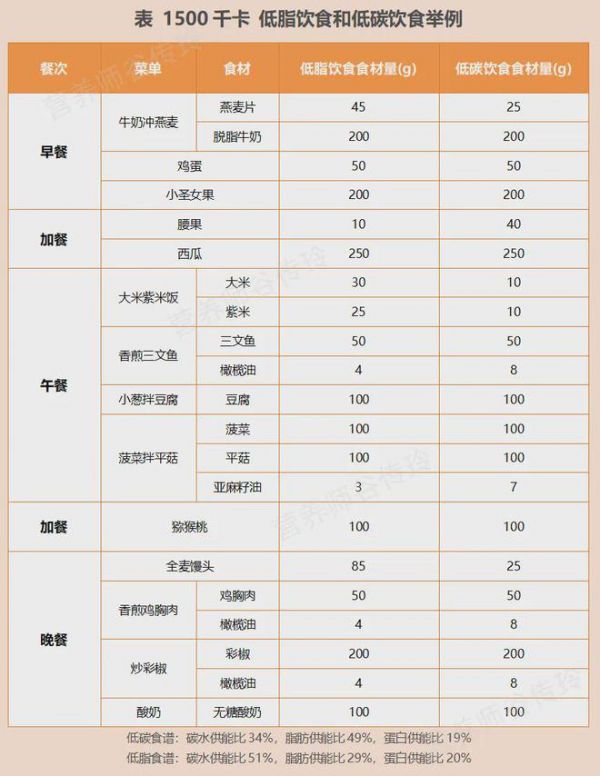 下面我會用相同的食材,變換食材的量,給出一個低碳食譜,一個低脂食譜,能量都是1500千卡/天,供大家感受食物的量,參考著吃。