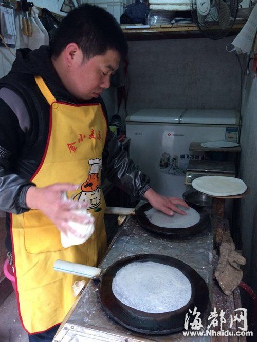 葉智彬說,做餅皮的手藝很關鍵,如果還不熟練,就得兩個人配合攤餅,一個人負責抹漿,一個專門拿鏟子把餅皮鏟起來。而他的手藝是家傳的,完全可以一個人“左右開弓”,同時在兩個鐵板上操作。據葉智彬介紹,漿的配比也很重要,但用料很簡單,只有米粉、水、食鹽和少許油。
