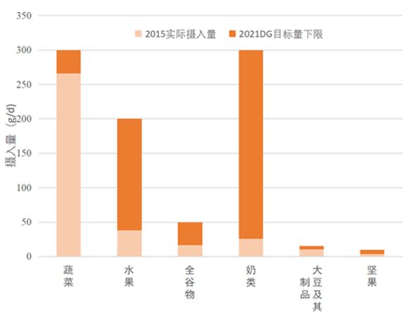 據(jù)2015年中國成人慢性病與營養(yǎng)監(jiān)測數(shù)據(jù)顯示,每標(biāo)準(zhǔn)人日蔬菜、水果、全谷物、奶類、大豆及堅(jiān)果類的平均攝入量分別為265.9g、38.1g、16.3g、25.9g和13.9g,均低于目前中國居民膳食指南的建議攝入量(圖3)。