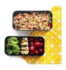 先做個炒飯,把三文魚提前處理腌一下,藜麥要煮熟除掉水分,準備好蔬菜丁、彩椒丁、洋蔥丁,然后把三文魚放鍋里煎熟,熟了弄碎,藜麥、蔬菜丁、彩椒丁、洋蔥丁倒進去一起炒,最后加調味料、鹽、耗油,炒熟了就裝起來。再做個雞肉,選雞胸肉,把它用料理機打成肉沫,準備好香菇丁、蔬菜丁倒進肉末里,加調味料、鹽,給它搓成扁圓型,最后煎熟。西蘭花切小過熱水弄熟,用生抽、蒜蓉拌一下,櫻桃適量。