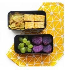 西葫蘆洗干凈切片,剝點蒜拍碎,熱鍋加油下蒜碎炒幾下再加入西葫蘆片,加調味料、鹽、蠔油炒,炒熟裝起來。打三個雞蛋和30克的牛奶到碗里,加一點鹽,然后煎一下,熟了就卷起來切,好了裝起來。洗一點青提裝進去。