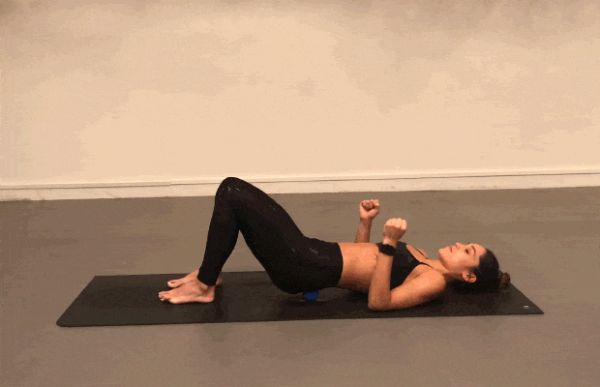 仰躺在墊子上,膝蓋彎曲,將按摩球放在脊柱和肩胛骨之間的位置,確保同時(shí)接觸到你的頸部、肩部以及上背部。 頭靠在墊子上,胸部打開(kāi),將臀部抬起做一個(gè)類(lèi)似臀橋的姿勢(shì),用力按壓按摩球同時(shí)身體向上滾(也就是球往下滾) 接著,手臂伸直朝向天花板,手掌心朝前(腳的方向),接著畫(huà)半圓(如圖) 堅(jiān)持30s-2min
