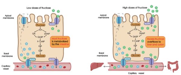 葡萄糖和果糖的化學(xué)式相同,均為C6H12O6,長(zhǎng)期以來(lái)人們認(rèn)為它們對(duì)健康的影響是等效的。然而,它們的代謝效應(yīng)存在顯著差異。該綜述通過(guò)比較葡萄糖和果糖的腸道和肝臟的胞內(nèi)代謝和轉(zhuǎn)運(yùn)機(jī)制來(lái)探尋過(guò)量果糖攝入與慢性代謝紊亂的關(guān)系。雖然以前的研究普遍認(rèn)為肝臟是果糖代謝的主要部位,但最近的證據(jù)表明,腸-肝軸在果糖代謝中起著至關(guān)重要的作用。低劑量果糖主要在小腸內(nèi)代謝。只有當(dāng)攝入量超過(guò)腸道的代謝能力時(shí),果糖才會(huì)溢出來(lái),在肝臟中代謝。高果糖飲食還對(duì)腸道微生物群的多樣性產(chǎn)生重大影響。高果糖飲食下腸道細(xì)菌產(chǎn)生的代謝副產(chǎn)物譜發(fā)生改變,導(dǎo)致腸道屏障通透性增加,誘發(fā)代謝性內(nèi)毒素血癥和代謝紊亂。