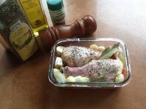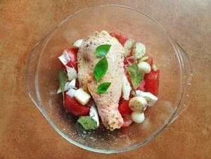 雞腿 大蒜一整個 大蔥適量 蕃茄(圣女果都行)看盤子大小 鋪滿底部就行 橄欖油適量 香葉2片 粗鹽粒/鹽/海鹽 胡椒粉(黑白都可) 薄荷葉