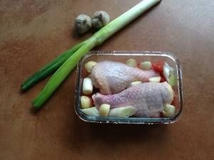 將雞腿放在蕃茄上面,雞腿旁邊擺上切好的大蔥段 和 蒜頭(不用剝蒜皮,相信我?。?/p>