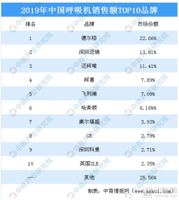 中國呼吸機(jī)產(chǎn)業(yè)2019年國內(nèi)市場容量(按出廠價(jià)計(jì)算)在120億元左右,是生命支持系統(tǒng)最主要的設(shè)備,其中高端醫(yī)用呼吸機(jī)市場由德國和美國行業(yè)巨頭壟斷市場份額的80%以上,國內(nèi)產(chǎn)品中新生兒高頻、常頻呼吸機(jī)生產(chǎn)為國內(nèi)行業(yè)空白。