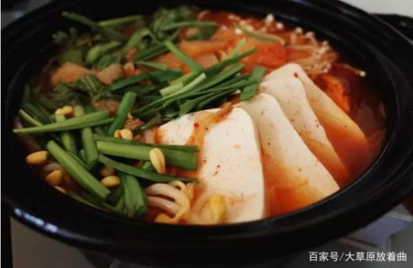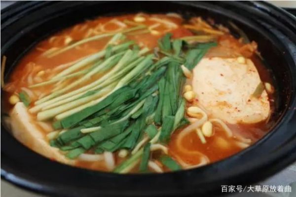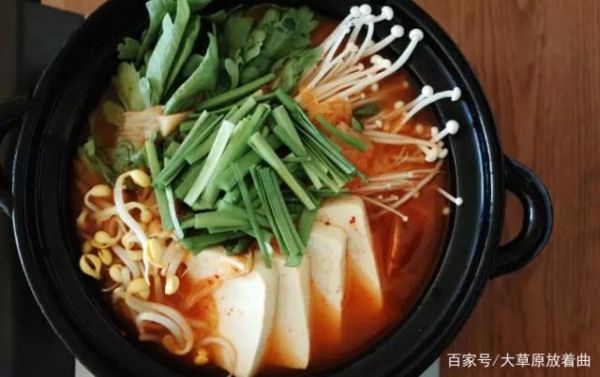 總的來(lái)說(shuō)做這個(gè)韓式泡菜鍋是非常簡(jiǎn)單的,首先我們先準(zhǔn)備好一包泡菜,除此之外再熬一鍋雞湯,雞湯可以直接用土雞來(lái)熬湯,也可以到市場(chǎng)買,去骨的雞架直接來(lái)熬成湯就可以了,用雞湯加泡菜,還有紅薯放在一整個(gè)鍋里面,用大火先煮沸,之后再轉(zhuǎn)成小火燉15分鐘,這樣我們的湯底就好了,如果你喜歡吃辣一點(diǎn)的味道的話,那么我們可以用,在另外加兩勺韓式的辣醬在鍋底,不過這一種辣醬經(jīng)常都會(huì)沉底,所以最好是不時(shí)的用肉勺攪拌一下,這樣才能夠更好的水味道擴(kuò)散到湯底的每個(gè)部分。解決了湯底剩下的東西就非常簡(jiǎn)單了,喜歡吃什么就下什么,今天我們的主題是高纖低卡,所以基本上用的都是一些比較低卡路里的食材。