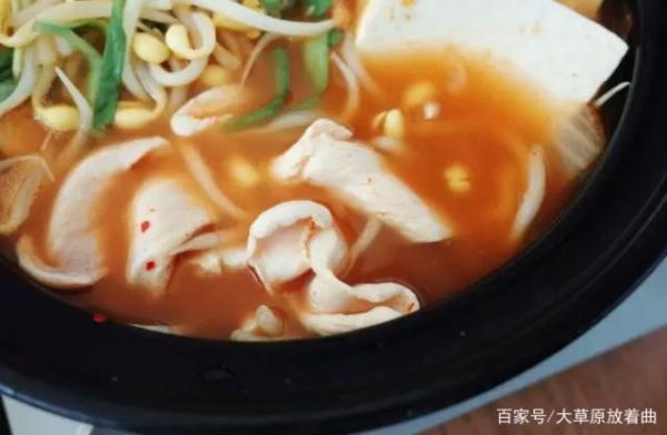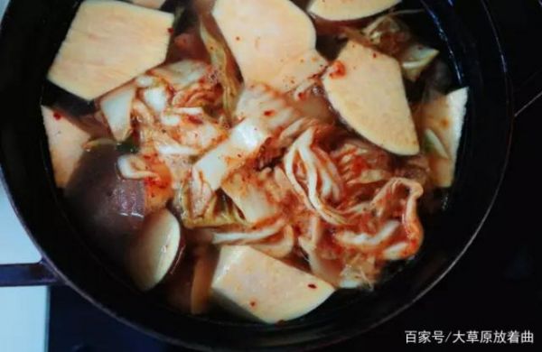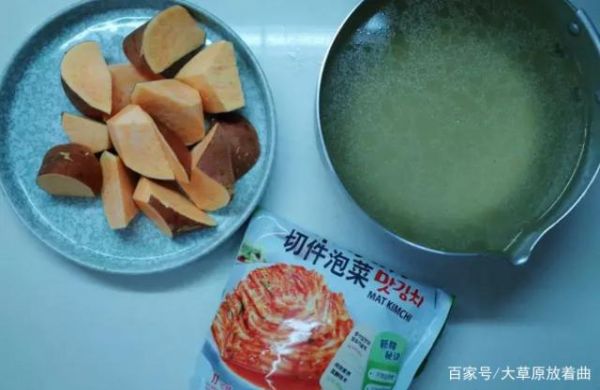 個(gè)人比較建議用紅薯,因?yàn)榧t薯比較高纖,所以在減肥的時(shí)候可以很好的幫助腸道的蠕動(dòng),能夠更好的消化和吸收之后,我們就將準(zhǔn)備好的紅薯雞湯,還有韓式泡菜,一起放到一個(gè)足夠大的湯鍋里面,之后再直接用中火將里面的湯煮沸之后再轉(zhuǎn)成小火,再用小火慢慢的熬煮15分鐘,這樣我們就得到了一鍋?lái)n式泡菜的湯底,接下來(lái)我們就可以來(lái)準(zhǔn)備其他的食材了,要注意在煮的時(shí)候鍋?zhàn)颖仨殙虼?,這樣才能夠使得湯底翻滾起來(lái),而且15分鐘的煮可能不能夠使紅薯完全熟透,所以我們紅薯后來(lái)還要放在里面繼續(xù)的加熱,如果你喜歡吃辣的話,那么也可以在湯底再加兩勺韓式辣醬,不過這樣煮起來(lái)需要用漏勺不時(shí)的攪拌均勻,否則他可能會(huì)沉下去煮不勻。
