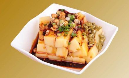 吃法:舀入碗中,再將切好的大頭菜、鹽菜、酥黃豆、酥花生、蔥花放于米豆腐上,用小碗放入紅油、麻油、花椒油、醬油、醋、姜汁、蒜水等調(diào)料對(duì)成汁,澆淋于米豆腐上,吃起來口感清新舒爽,分外好吃。
