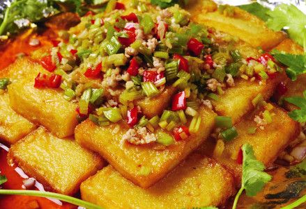食用時(shí)將其切成薄片,貼在鍋面上,加清油炕至微黃,再將鹽、蔥、辣、花椒等香料下鍋炒勻,就是一份香脆可口、甜咸麻辣俱全的炒“豆腐”,而米豆腐除了和臘肉、回鍋肉翻炒之外,還可以油炸、燙火鍋等多種吃法。