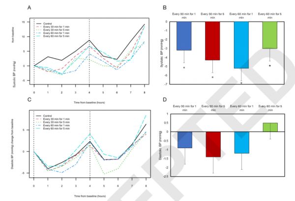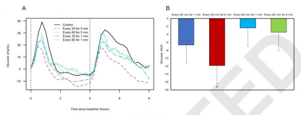 本研究是一項(xiàng)隨機(jī)交叉研究,11 位中老年人在不同的五天,在符合人體工學(xué)的椅子上坐了 8 個(gè)小時(shí),每天完成不同的久坐-起身步行模式:每坐 30 分鐘后步行 1 分鐘、坐 60 分鐘后步行 1 分鐘、坐 30 分鐘后步行 5 分鐘、坐 60 分鐘后步行 5 分鐘、一直久坐。每 15 分鐘和 60 分鐘測量一次血糖和血壓。