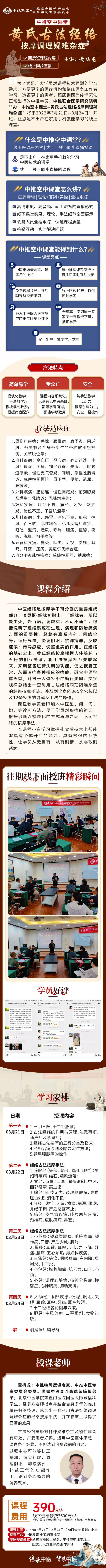 第三天:經(jīng)絡(luò)古法按摩手法:1. 小腸經(jīng):頸肩腰腿痛、手腕疼痛、頸椎病、口苦、產(chǎn)后少乳、胸悶;2. 腎經(jīng):耳聾、耳鳴、記憶力下降、牙痛、腰痛、五心煩熱、男婦科疾?。?. 三焦經(jīng):頭痛、咽喉疼痛、白內(nèi)障、肩周炎、中耳炎;4. 心包經(jīng):胸憋胸痛、肌無力、口干、心煩;5. 心經(jīng):調(diào)理心臟病、精神分裂癥、抑郁癥、心悸胸痛、胸肋支滿;第四天:1. 大腸經(jīng):眼部疾患、、腸阻、、耳聾、耳鳴、牙痛、腸鳴腹瀉;2. 十二經(jīng)絡(luò)各論圖與穴歌。3. 膽經(jīng):中風(fēng)偏癱、口歪眼斜、食物過敏;四、主講專家:黃梅龍:中推特聘授課專家,中推中醫(yī)專家委員會(huì)委員。國家中醫(yī)泰斗高德榮嫡傳弟子;北京中醫(yī)學(xué)院東直門國醫(yī)大師藏??茖W(xué)生。經(jīng)多方名師指點(diǎn)并結(jié)合自身多年的臨床精研歸納整理,總結(jié)出一套利用古法經(jīng)絡(luò)調(diào)理疑難雜癥的經(jīng)絡(luò)按摩手法,并在臨床上取得了顯著的效果。古法經(jīng)絡(luò)按摩對(duì)各種疑難雜癥及慢皆有奇效,廣受患者好評(píng)。運(yùn)用中醫(yī)整體思想,調(diào)理各個(gè)經(jīng)絡(luò),不但達(dá)到治病調(diào)病的目地,在治療過程中亦可能夠扶正祛邪,瀉實(shí)補(bǔ)虛,調(diào)理陰陽,卻除病邪,補(bǔ)益正氣的功能作用,得到身心暢通的調(diào)養(yǎng)效果。1、研修費(fèi)每人3600元(包括:資料費(fèi)、證書費(fèi))。食宿可協(xié)助安排,費(fèi)用自理。2022年03月21日--03月24日(20日全天報(bào)到) 北京2022年04月24日--04月27日(23日全天報(bào)到) 北京
