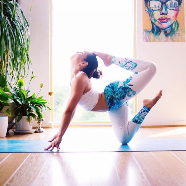 雙手指尖撐地,手臂向前伸直,左腳膝蓋著地,小腿向上翹起,右腳向后抬起、彎曲,右腳尖碰觸頭頂,頭部向后仰,挺胸后仰。身體依靠十個指尖和一個膝蓋支撐,容易傾倒,平衡感不夠,注意力要集中,要時刻掌握平衡。身體的全方位拉伸,拉筋的同時,也張大了毛孔,對排毒去濁也有一定的效益。