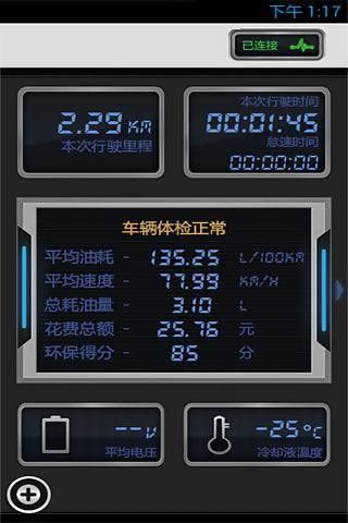 實(shí)時(shí)車況,車輛行駛過(guò)程中的狀況,包括當(dāng)前行駛里程、行駛時(shí)間、怠速時(shí)間、平均油耗、平均速度、耗油量、駕駛得分、平均電壓、冷卻液溫度等;