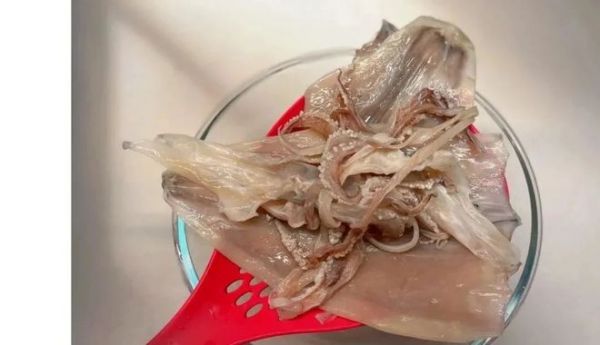 第一步:將買回來的魷魚干放入水中浸泡20分鐘,水中浸泡可以軟化魷魚干,煮出來有嚼勁不至于太干硬。水中泡的時間不能過程,太長會將魷魚鮮味淡化了。