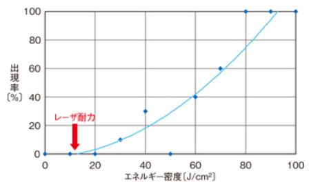 相對能量密度,在圖表中表示損傷的出現(xiàn)率,從出現(xiàn)率曲線求出臨界(出現(xiàn)率為0%和0%以上的分界線)的能量密度,將這個數(shù)值定為激光損傷閾值damage threshold。