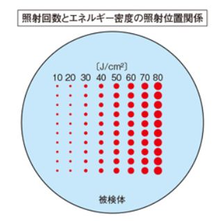 將檢測對象裝載在可以改變照射位置的XY軸位移臺上,每次照射結束后改變位置。重復發(fā)射脈沖激光,在同一部位照射S次激光脈沖。接著改變位置再次以相同能量照射S次。如此重復地使用相同能量照射檢測對象的10個位置。然后改變激光能量,同樣地在10處進行照射S次,這就是S-on-1。在激光能量可以調節(jié)的范圍內重復這個操作,最后使用150倍的顯微鏡觀察檢測對象的薄膜有無損傷。