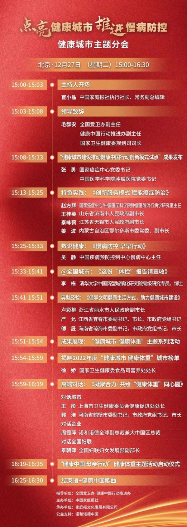 2022年度全國愛國衛(wèi)生運動大會——“點亮健康城市 推進慢病防控”健康城市主題分會由全國愛衛(wèi)辦、健康中國行動推進辦指導(dǎo),中國家庭報社主辦,家庭報文化發(fā)展有限公司承辦,諾和諾德中國公益支持。活動通過新華網(wǎng)、中國家庭報直播平臺、新浪微博、北京時間、央視頻、優(yōu)酷、抖音等平臺同步直播。