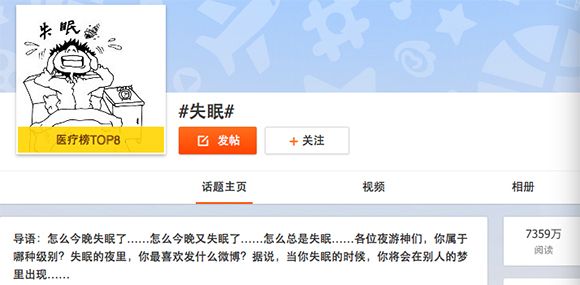 豆瓣上,創(chuàng)建于2006年7月的“失眠救世界”小組,至今仍聚集了1500多位成員。打卡簽到、答疑解惑,小組內(nèi)話題不斷,最后回復(fù)時(shí)間從晚上8點(diǎn)到凌晨4點(diǎn)不等。微博上有大V每晚零點(diǎn)準(zhǔn)時(shí)發(fā)布話題,召集那些睡不著的男女一起聊天,評論數(shù)量動(dòng)輒五六萬。